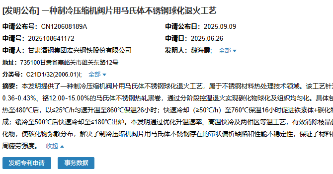 時(shí)間:09/10/2025 01:25:369月9日,甘肅酒鋼集團(tuán)宏興鋼鐵股份有限公司成功申請(qǐng)一項(xiàng)名為“一種制冷壓縮機(jī)閥片用馬氏體不銹鋼球化退火工藝”專利,申請(qǐng)公布號(hào)為CN120608189A,申請(qǐng)日期為2025年6月26日。