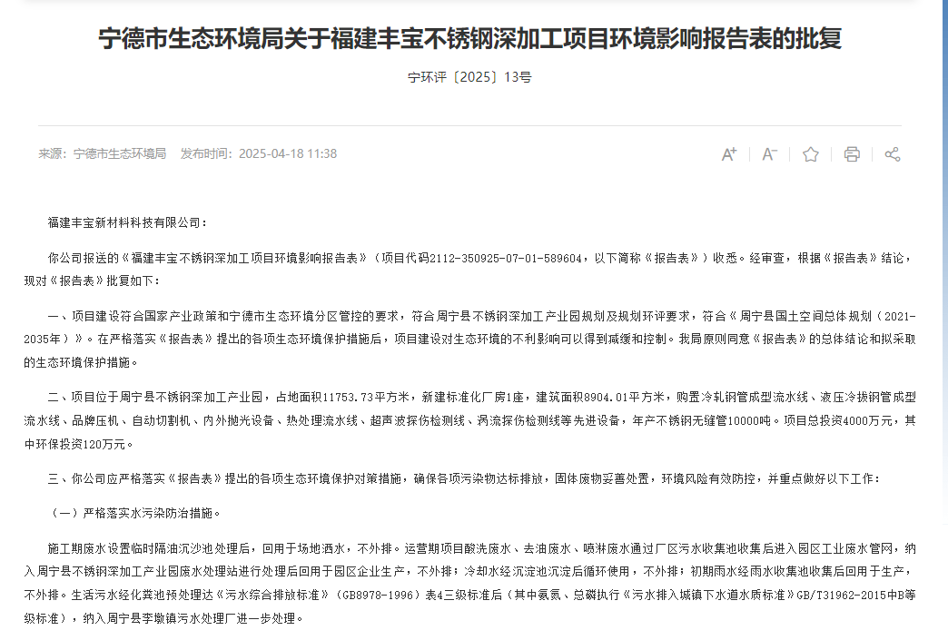 福建豐寶不銹鋼深加工項目環評獲同意通過