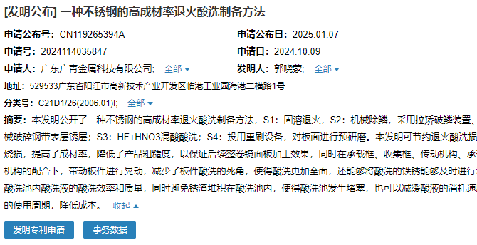 2025年1月7日,廣東廣青金屬科技有限公司成功申請一項名為“一種不銹鋼的高成材率退火酸洗制備方法”專利,申請公布號為CN119265394A,申請日期為2024年10月9日。