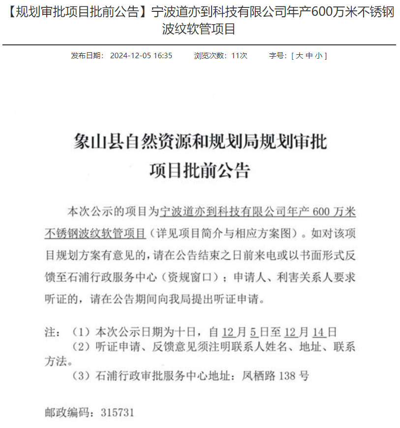 寧波道亦到年產600萬米不銹鋼波紋軟管項目規劃審批項目獲批前公告
