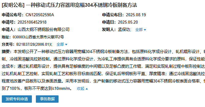 時間:08/20/2025 01:25:418月19日,山西太鋼不銹鋼股份有限公司成功申請一項名為“一種移動式壓力容器用寬幅304不銹鋼冷板制備方法”專利,申請公布號為CN120502590A,申請日期為2025年5月20日。