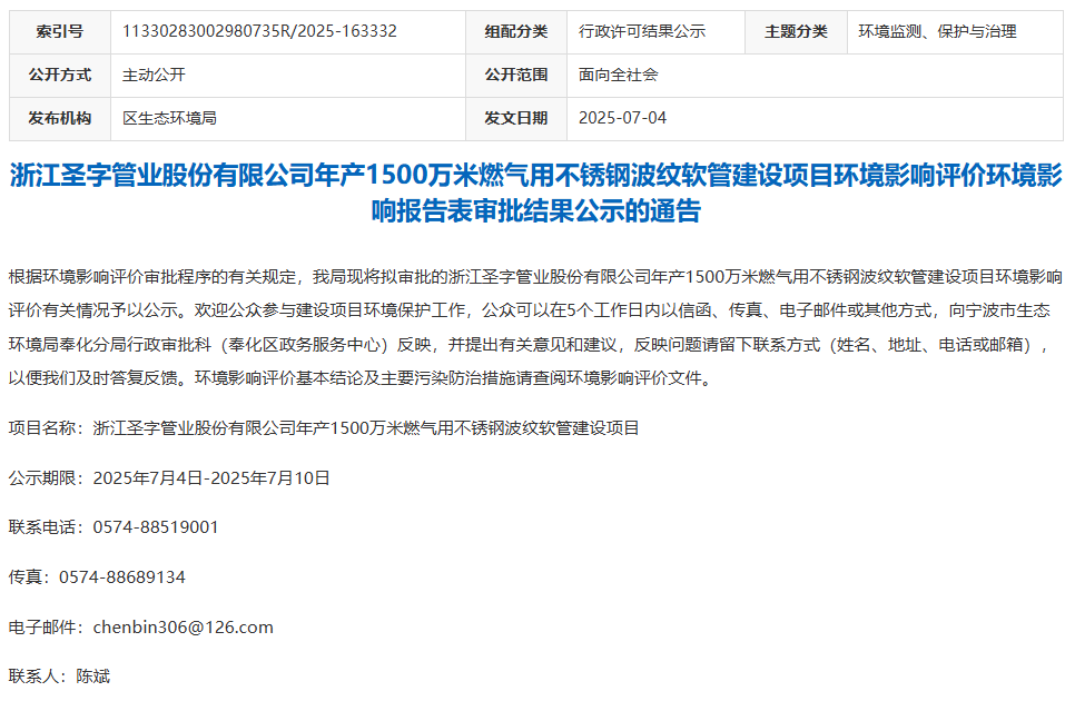 圣字管業(yè)年產(chǎn)1500萬米燃?xì)庥貌讳P鋼波紋軟管建設(shè)項(xiàng)目環(huán)評獲批公示